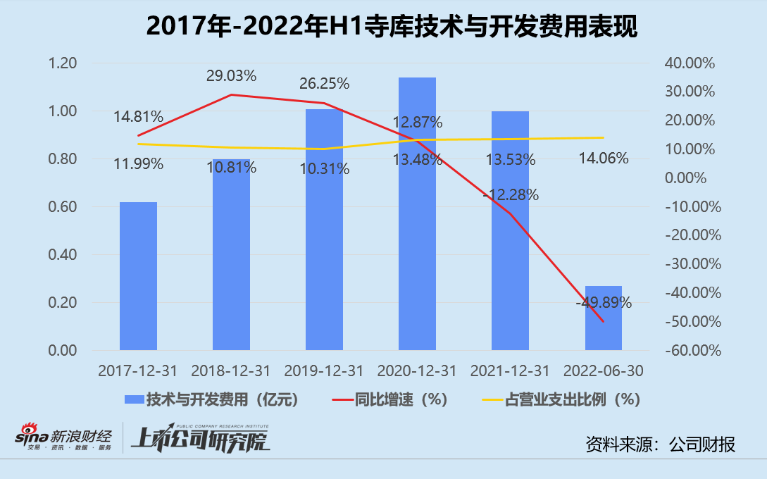 据财务报表披露数据显示,公司2021年全年的技术与开发费用仅为1亿元,同比下降12.87%。技术支持人员仅剩91人,同比减少52.91%。2022年上半年,研发费用约为2730.40万元,较2021年同期缩水近50%。