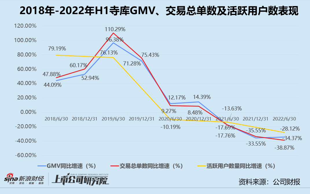 GMV和交易总单数继2021年上半年进入负增长阶段后,再度下探。截至2022年6月30日,公司GMV约为33亿元,同比下降34.37%;共完成88.03万单交易,与2021年上半年相比减少了38.87%。报告期内,在平台至少完成过1次交易的活跃用户数量同比缩水28.12%至40.89万名,不足2019年巅峰时期活跃用户总数的四分之一。