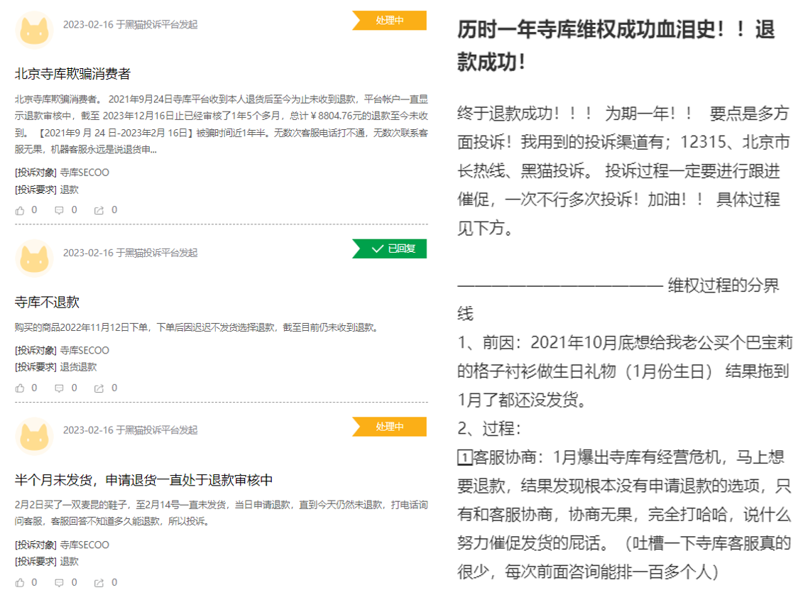 据公开报道显示,2022年1-10月,北京市消费者协会共收到3343件关于寺库的投诉,基本以商家拖延发货、拖延退款为主。黑猫投诉平台上,近30天内寺库共接到269条投诉,近乎每一条都是消费者控诉寺库既不发货也不退款。还有不少消费者在社交平台上分享艰难的维权历程,整整一年才成功收到退款。