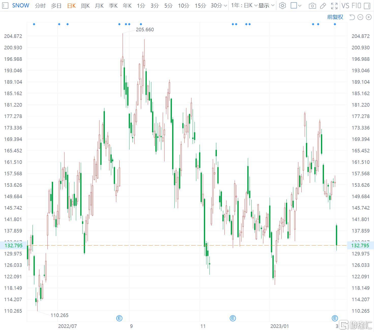 格隆汇3月2日丨Snowflake(SNOW.US)跌13.8%,报133.18美元,总市值428亿美元。Snowflake公布了该公司的2023财年第四季度及全年财报。报告显示,Snowflake第四季度总营收为5.890亿美元,与上年同期的3.838亿美元相比增长53%;净亏损为2.075亿美元,与上年同期的净亏损1.322亿美元相比有所扩大。展望2024财年,Snowflake预计第一季度总收入为6.24亿美元;产品收入将在5.68亿美元至5.73亿美元之间,低于分析师预期的5.821亿美元,同比增长率为44%至45%;分析师预计该公司第一季度每股收益为5美分。